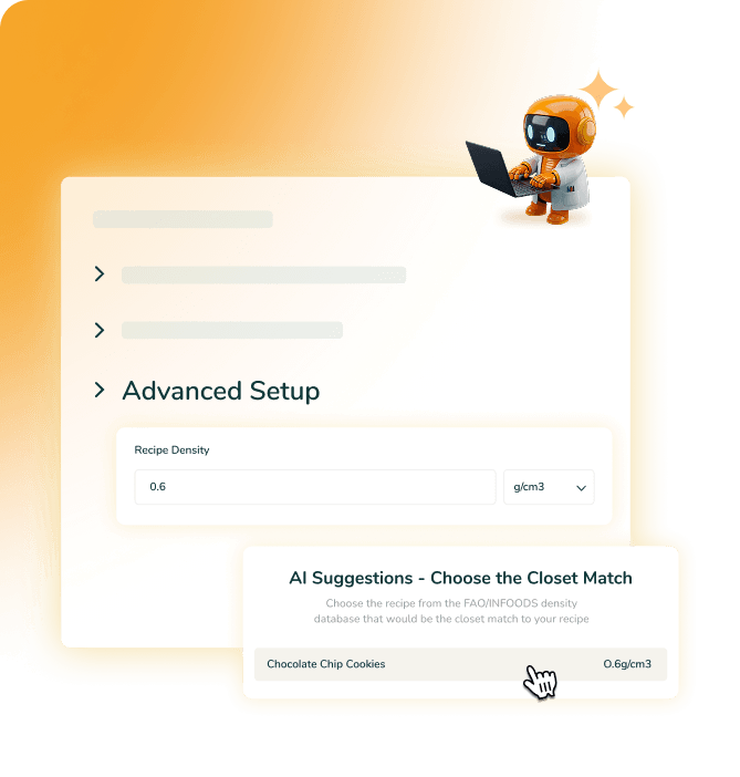 Get your recipe and ingredient density calculated based on its specific category, ensuring your volumes and weights align perfectly without manual math.