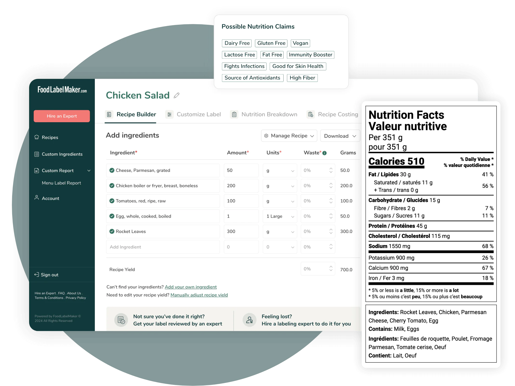 Our unique nutrition algorithm scans your recipe and suggests possible Nutrition & Marketing claims you can make based on the latest regulatory requirments in your market.