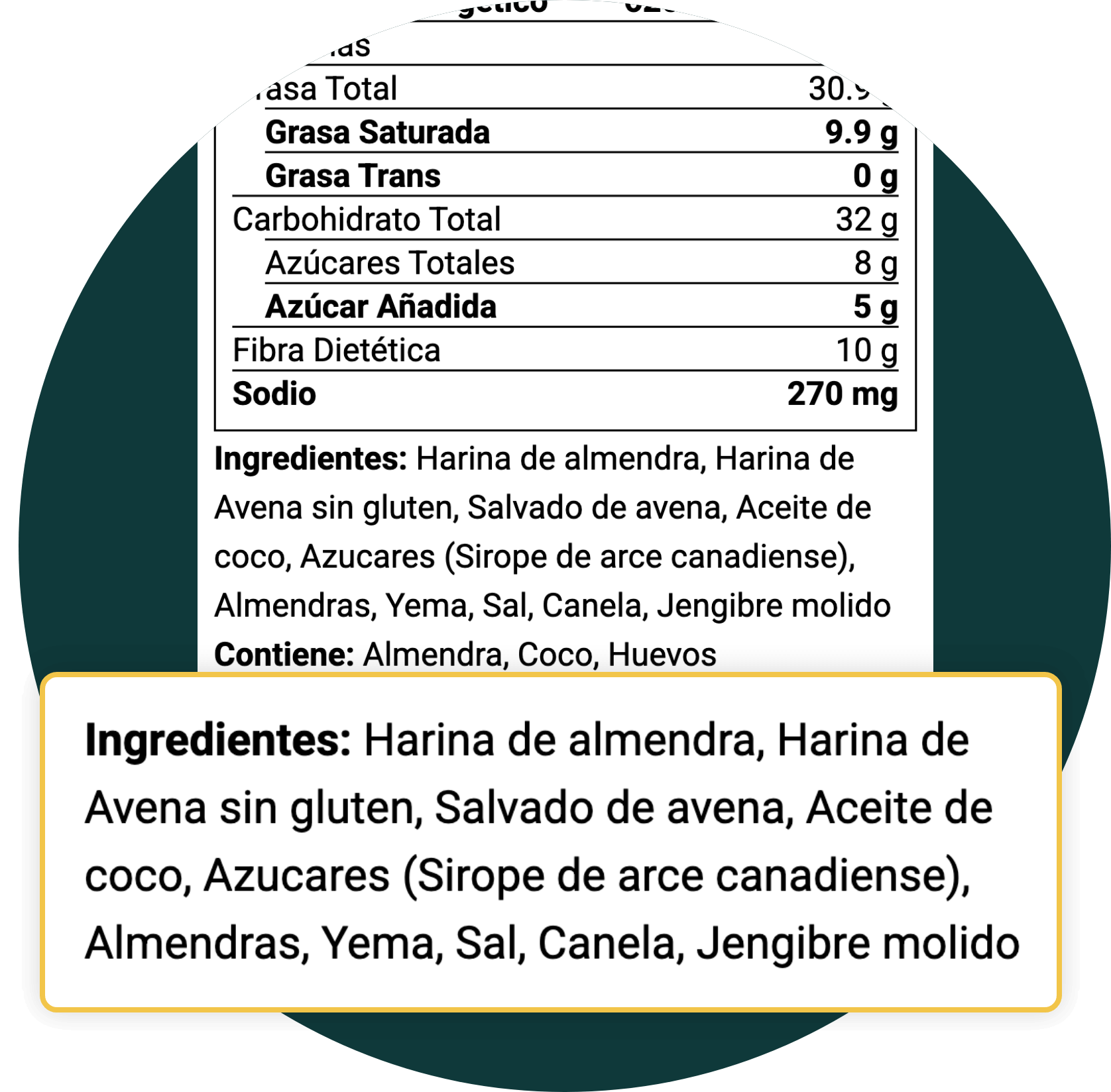 Mientras que el panel de Declaración Nutrimental muestra información nutricional cuantitativa (como calorías y grasas), la lista de ingredientes confirma los componentes reales utilizados para crear ese alimento.
