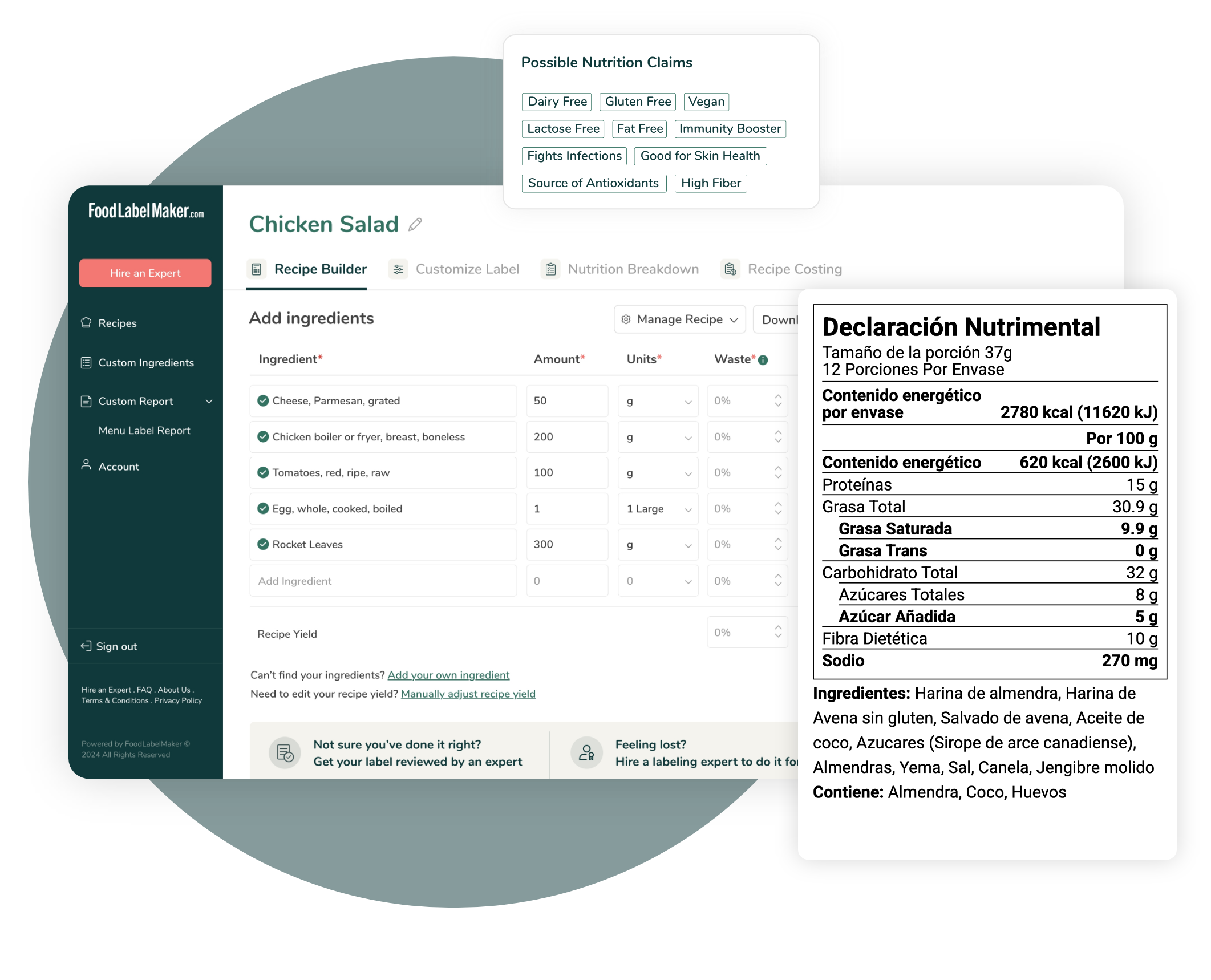 Asegúrese de que sus clientes puedan confiar en su producto. Regístrate para comenzar a generar listas de ingredientes transparentes y precisas hoy mismo.