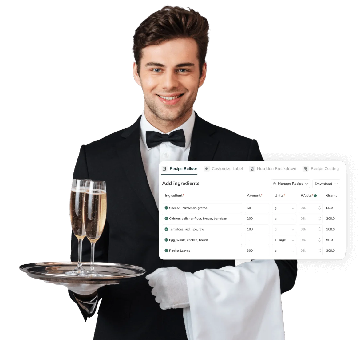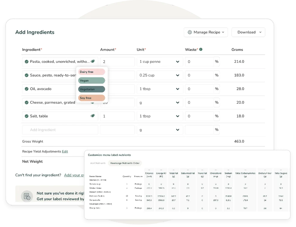 Crea recetas fácilmente utilizando nuestra base de datos de más de 500.000 ingredientes verificados, adapta las recetas con un solo clic y categoriza, duplica o elimina elementos para mejorar la organización y la eficiencia del menú.