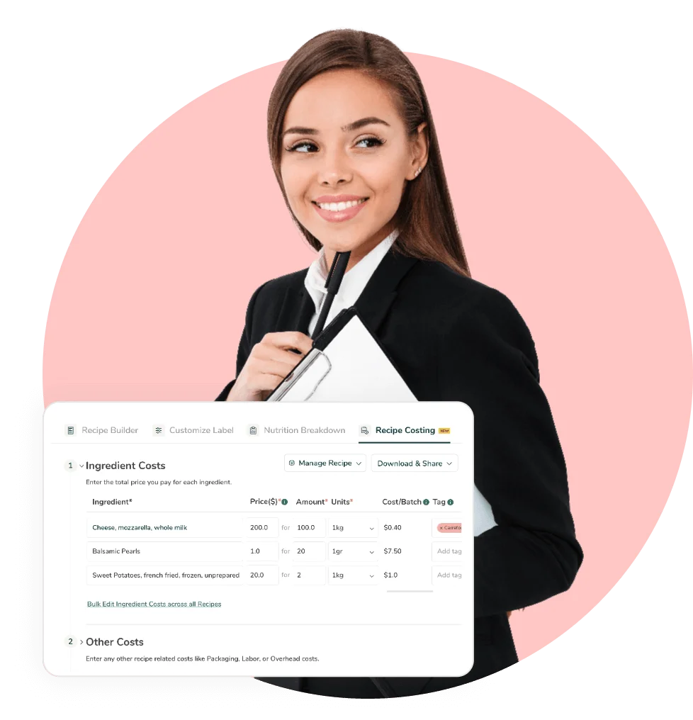 Calcula de forma rápida y precisa los costos de las recetas, incluidos los ingredientes, el empaque y la mano de obra, y establece con facilidad los precios de venta óptimos y los márgenes de ganancia objetivo.
