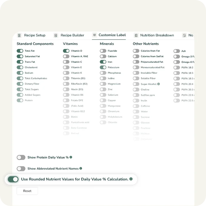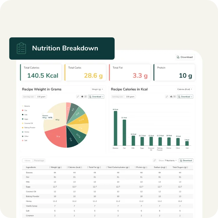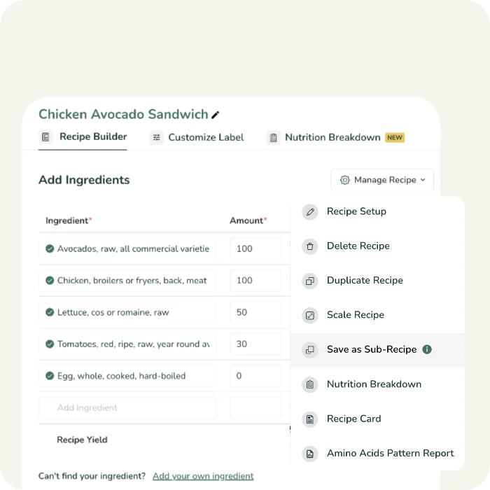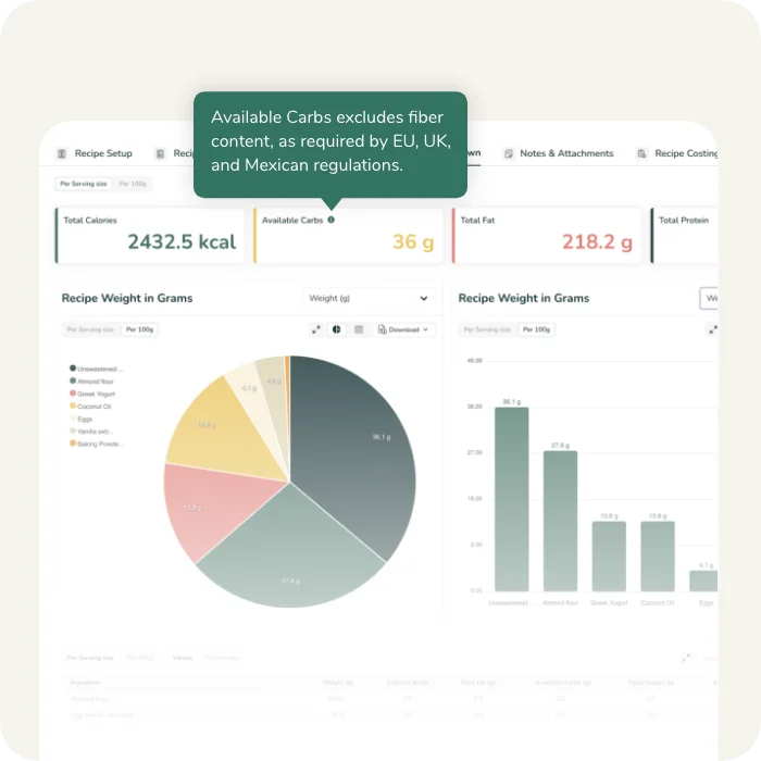 Obtenga un análisis en profundidad de los nutrientes, vitaminas y minerales de su receta. Identifique qué ingredientes están impulsando cada nutriente y tome decisiones informadas sobre cómo optimizar su receta.