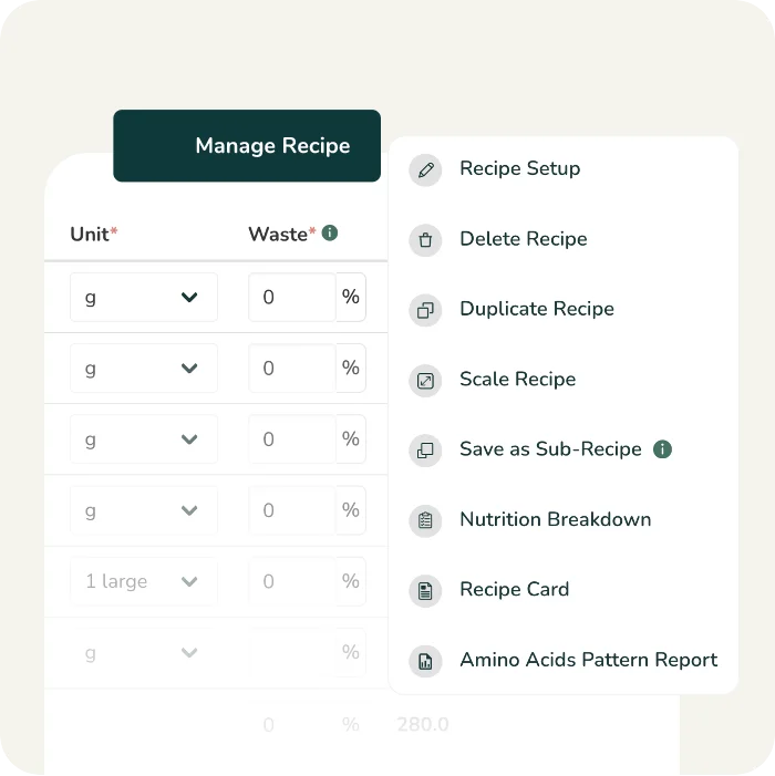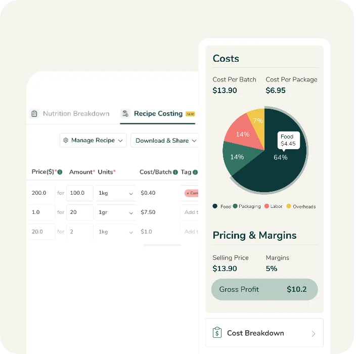 Calcule con rapidez y precisión los costes de sus recetas, incluidos ingredientes, envasado y mano de obra. Determine fácilmente el precio de venta óptimo, los márgenes de beneficio objetivo y el beneficio bruto.