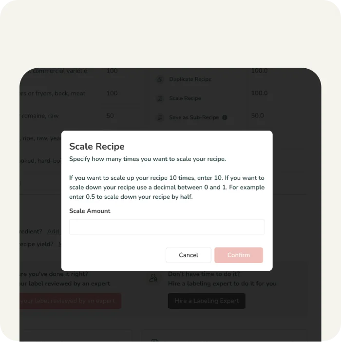 Aumente o reduzca la escala de su receta especificando el factor de escala y nuestra herramienta realizará automáticamente los cálculos por usted.