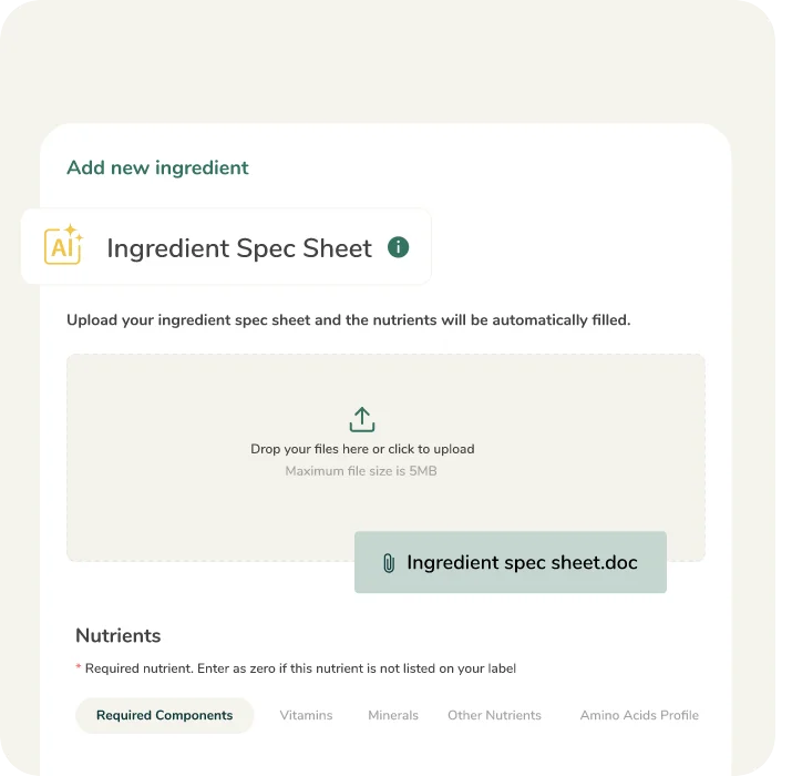 Sólo tiene que cargar su hoja de especificaciones de ingredientes y nuestra herramienta de inteligencia artificial leerá los nutrientes y rellenará automáticamente sus ingredientes personalizados.