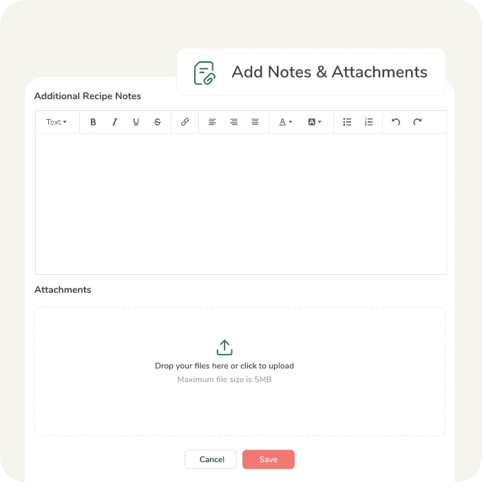 Añada notas personalizadas y varios archivos adjuntos, como tarjetas de recetas y hojas de especificaciones, a sus recetas o ingredientes personalizados.