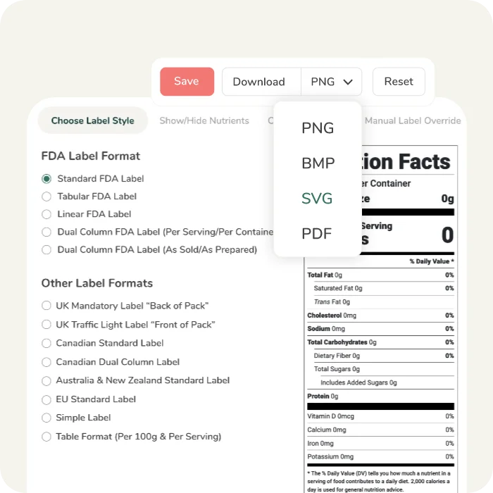 Descargue sus etiquetas en formatos de archivo de alta resolución como PDF, Vector SVG, BNP o PNG para el diseño de envases.
