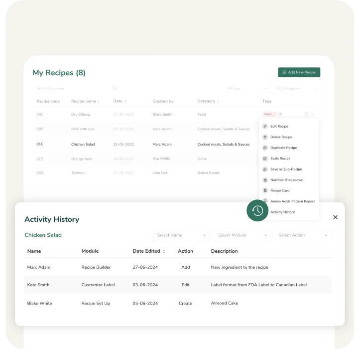 Mantenga un registro detallado de todos los cambios realizados en recetas e ingredientes, incluyendo quién realizó las actualizaciones. Realice un seguimiento de las revisiones y modificaciones para mejorar el control de versiones, el cumplimiento y la rendición de cuentas.