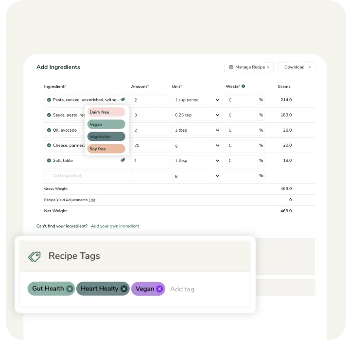 Organiza sin esfuerzo tus ingredientes y recetas con etiquetas como Keto, Vegan o Non-GMO, o crea etiquetas personalizadas que se adapten a tus necesidades. Las etiquetas facilitan la búsqueda, clasificación y gestión eficaz de tus artículos.