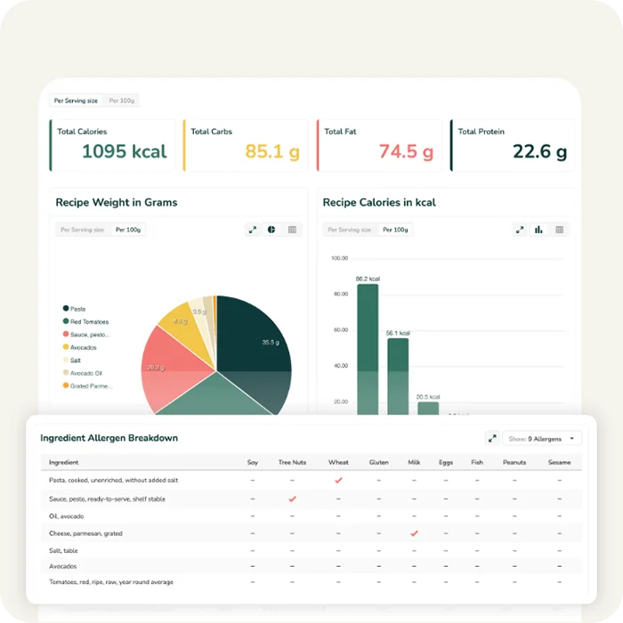 Controle fácilmente los alérgenos en sus recetas con nuestra nueva tabla de desglose de alérgenos en el informe de desglose nutricional de su receta. Ahora puede ver la presencia de alérgenos en cada ingrediente, activar o desactivar los alérgenos y descargar el informe completo.