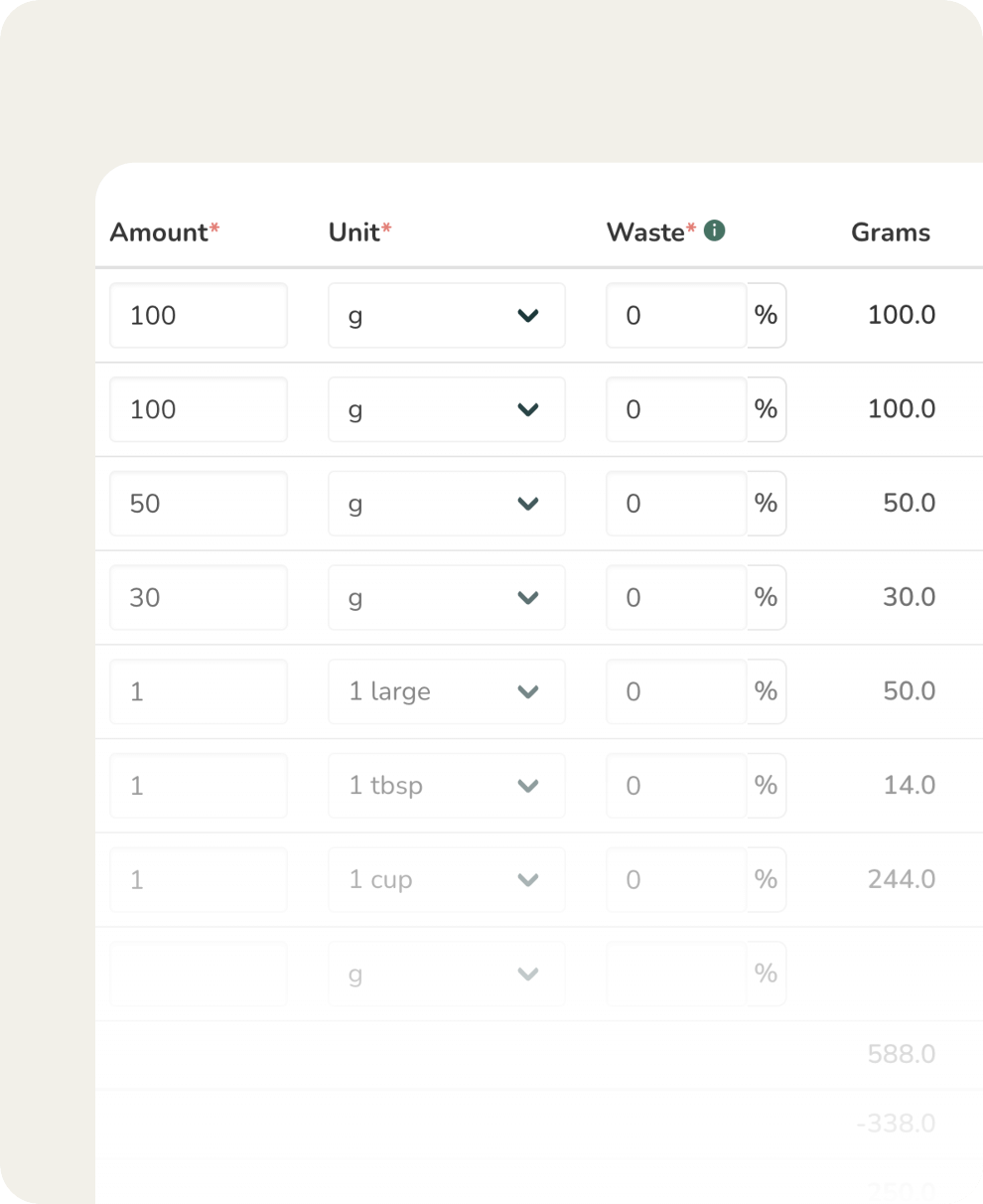 You can create your own! In your Recipe Builder section, you’ll find the option to Add a new ingredient, where you can either upload your spec sheet, and have our AI assistant fill in the information for you, or you can manually add the nutritional data.