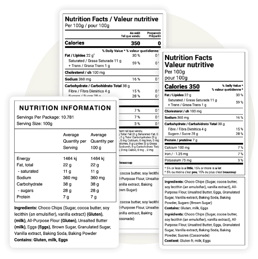 Ensure your products meet Canadian regulations with our CFIA bilingual nutrition label formats. Our software offers the two main label formats for the Canadian market, including: