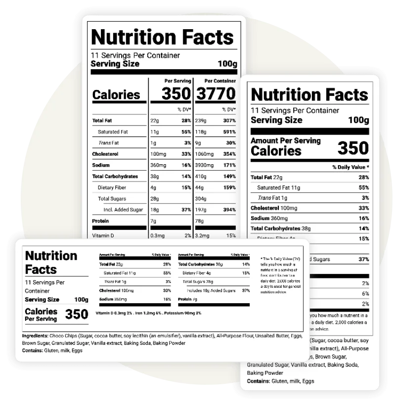 Our software generates any FDA-compliant nutrition label for products or package sizes in the U.S., including: