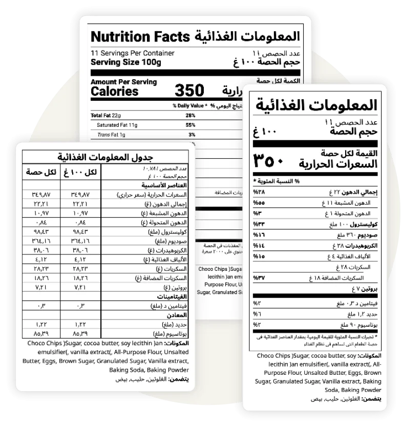 Expand into the Gulf Cooperation Council with labels that meet regional standards. Our platform generates GSO-compliant nutrition labels, including all required Arabic and bilingual formats such as: