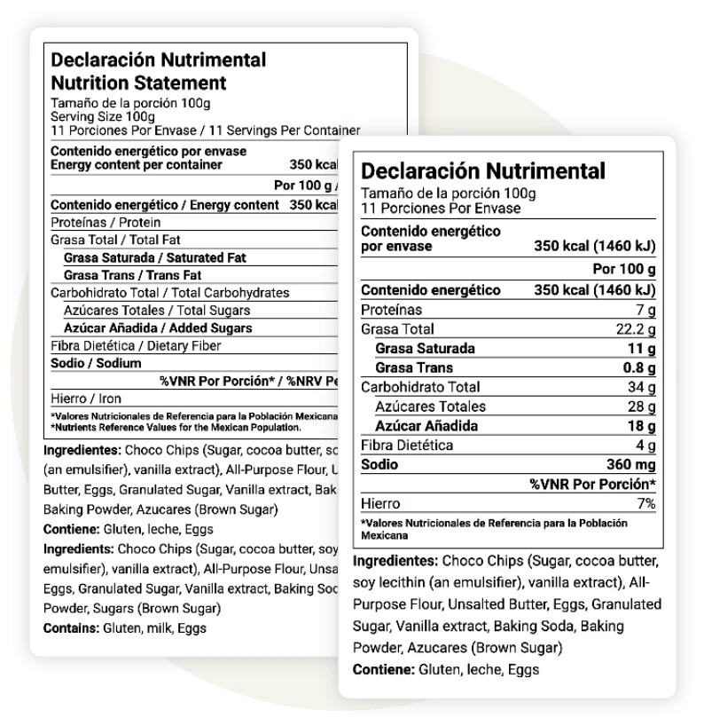 Enter the Mexican market with confidence. Our software generates COFEPRIS-compliant nutrition labels, including the mandatory new frontal warning labels and dual-language options, including: