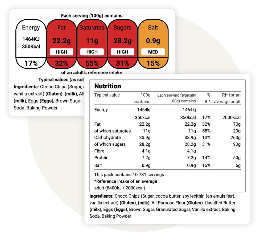 Easily generate FSA-compliant nutrition labels for the UK market. Our software supports mandatory and voluntary formats to meet Food Standards Agency guidelines, including: