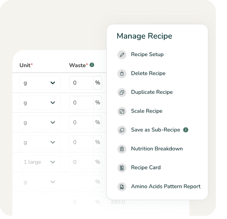 See nutritional details of multiple recipes in a single report. Get a full breakdown of your recipes’ macros, vitamins and minerals, and choose to show/hide the nutrients you want to include.