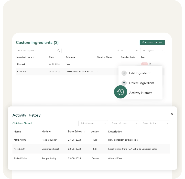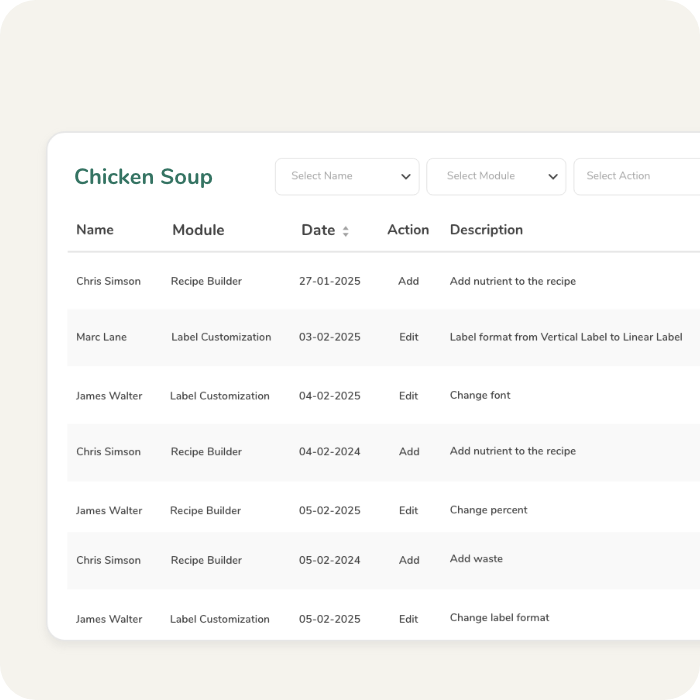 Keep a detailed record of all changes made to recipes and ingredients, including who made the updates. Track revisions and modifications for better version control, compliance, and accountability.