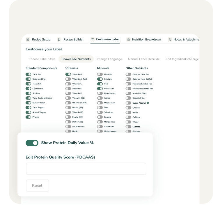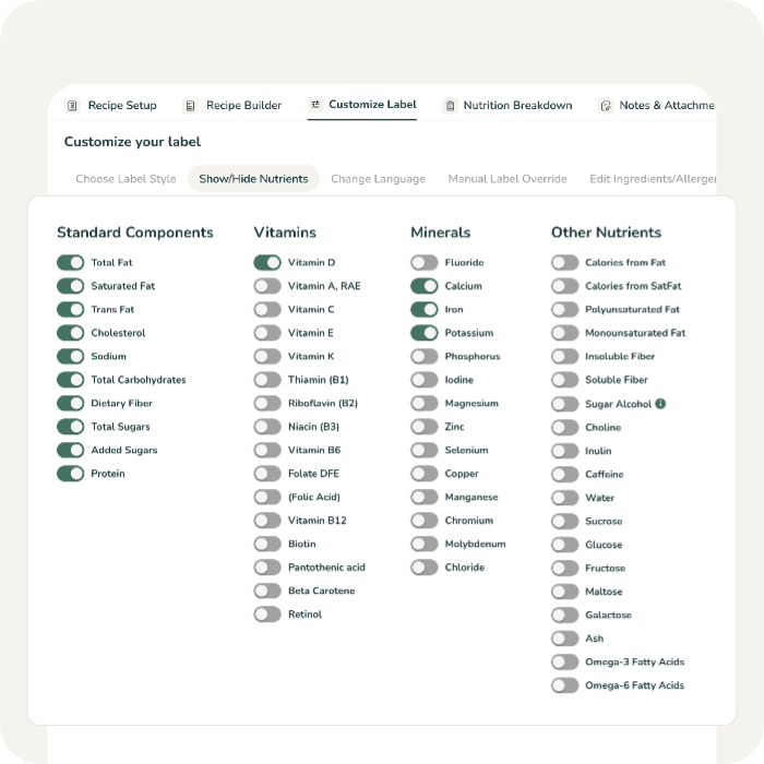 Customize your label by choosing to show or hide any of your nutrients, minerals, or vitamins to meet your customers’ needs.