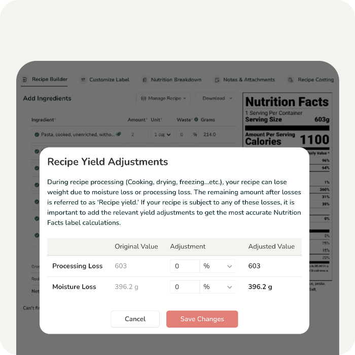 Manually adjust your recipe yield to account for moisture loss due to cooking, drying, freezing, etc