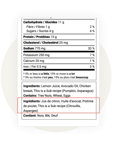 Afin d’assurer l’exactitude des étiquettes, nous avons besoin de votre recette standardisée comprenant : la liste des ingrédients, leurs quantités correspondantes (de préférence en grammes), le rendement final (poids total du produit fini ou transformé) et la taille de portion (le cas échéant). Si vous disposez déjà de valeurs nutritionnelles pour certains produits de marque inclus dans votre recette, cela peut aussi nous être utile.