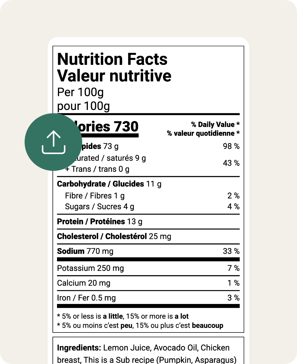 Téléchargez une fiche technique d’ingrédient ou une image d’une étiquette nutritionnelle, et notre assistant IA remplira automatiquement les nutriments pour votre ingrédient personnalisé.