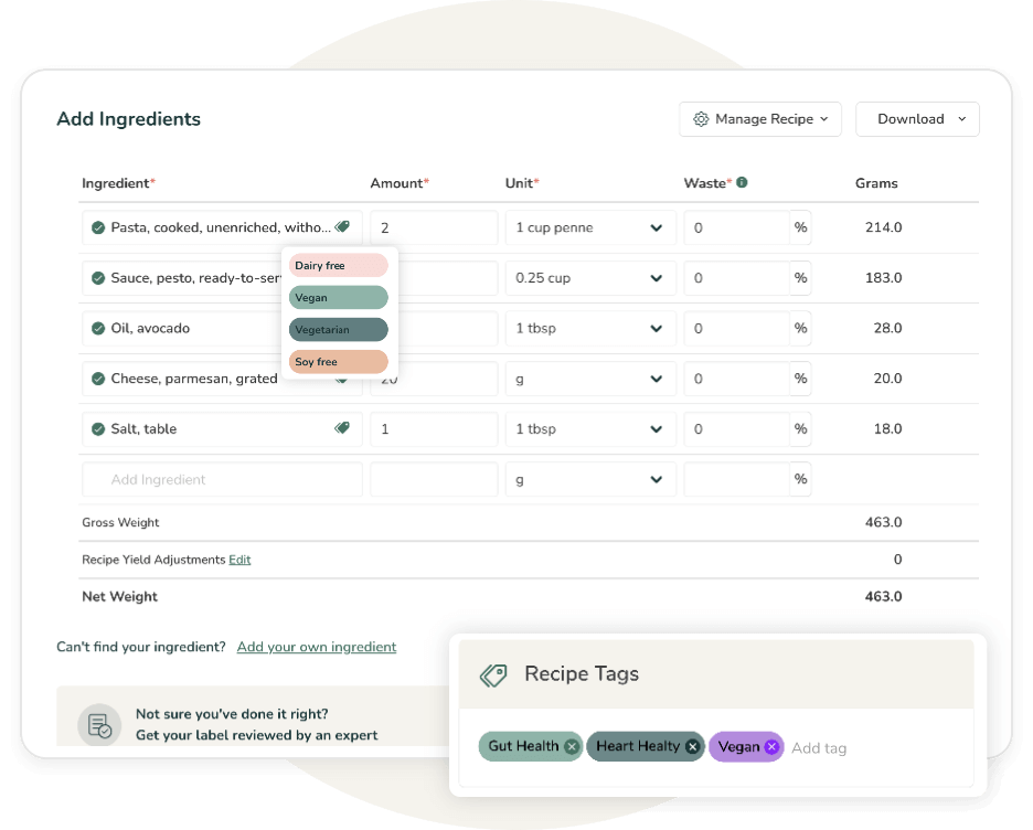 Assurez une exactitude nutritionnelle grâce à notre base de données complète de plus de 500 000 ingrédients vérifiés par nos nutritionnistes.