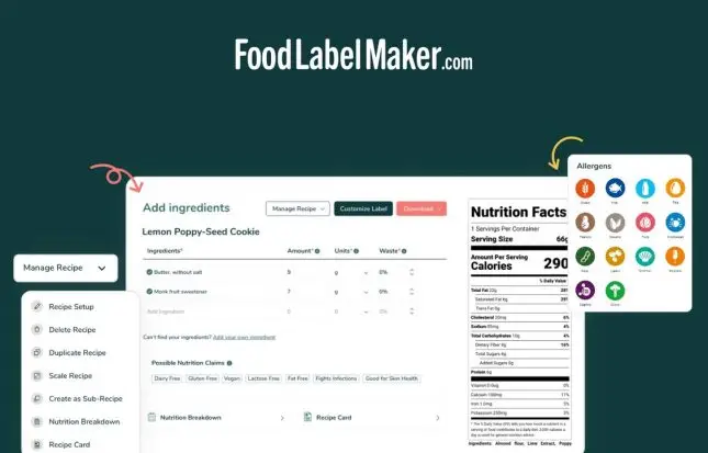 - Food Label Maker’s unique software even suggests possible nutrition claims that may go with your recipe. This allows you to highlight your product’s nutritional benefits/value.