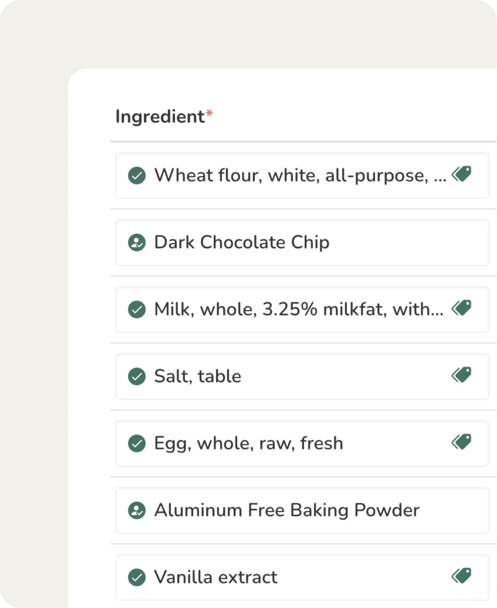 Custom ingredients are automatically added to our ingredient database, so nutritional information remains consistent and compliant across your product line.
