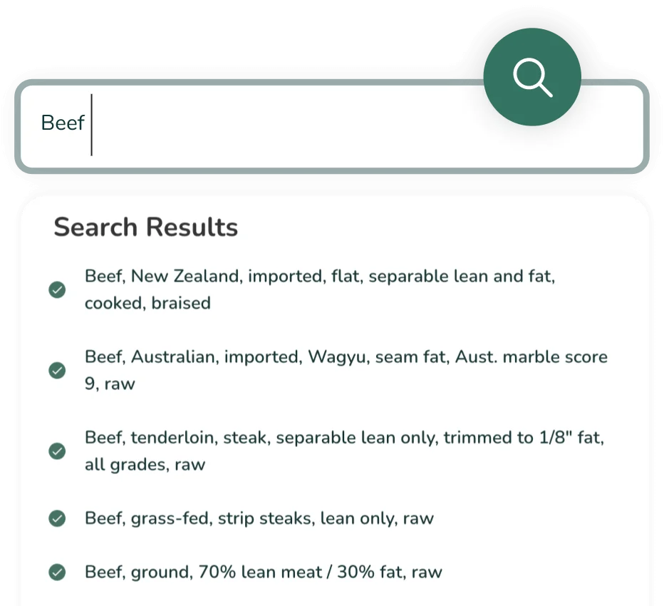 Simply type in your ingredient and select your preferred option from the dropdown list. Once you add your ingredient, it will have preloaded nutrition facts. You’ll have access to verified USDA database ingredients, ingredients from verified users, or you can create your own custom ingredients.