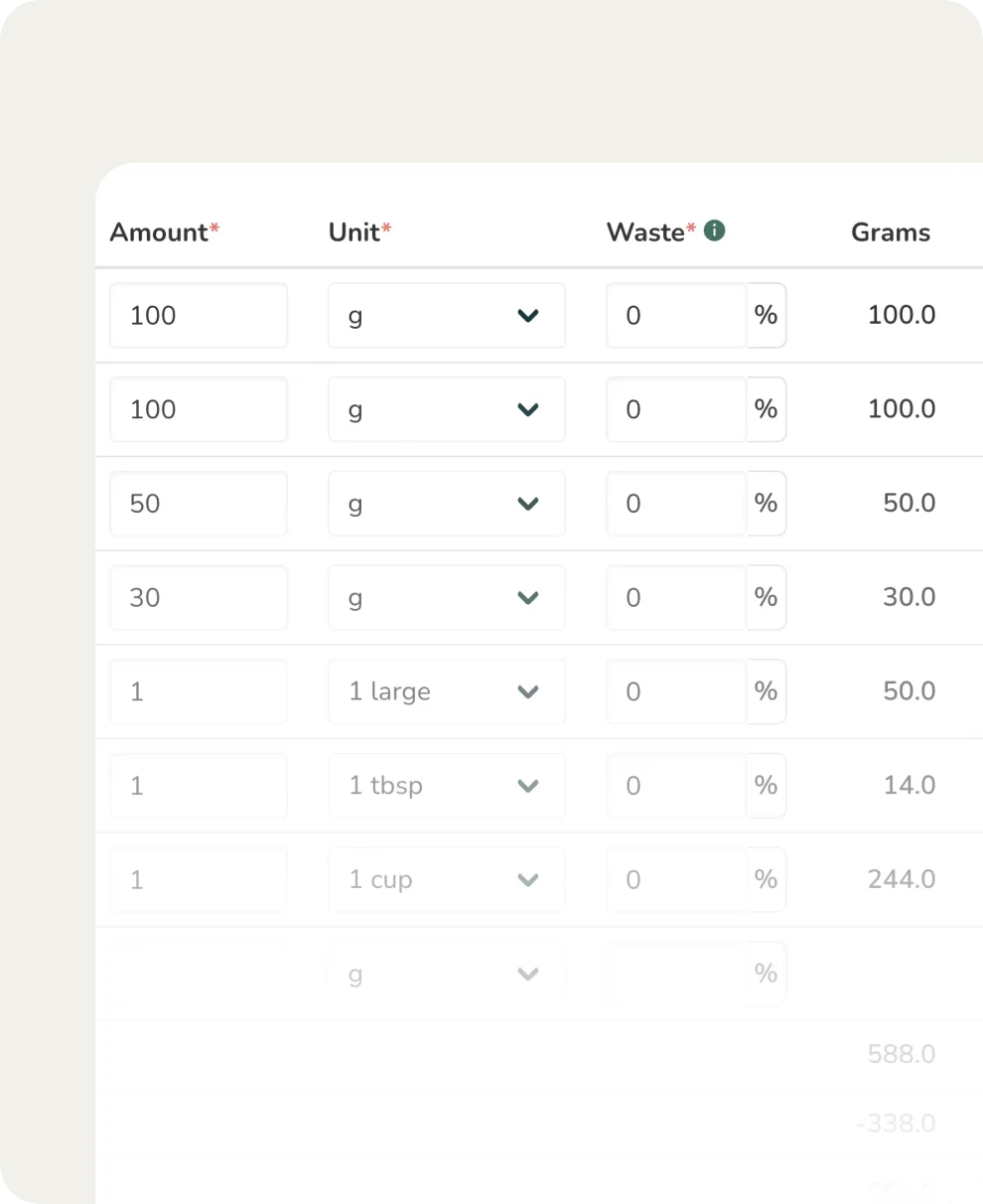 Then, add the numerical amount and its unit by portion, weight or volume. For unit conversions, either use the ingredient’s density or “RIA”, our intuitive AI Bot.