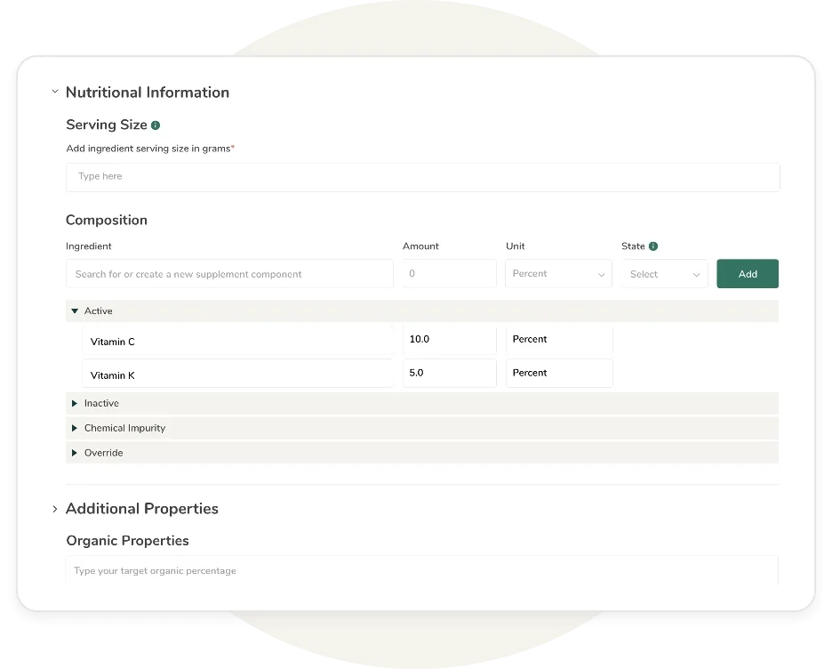 Easily review the nutrition profile of the supplement formulas, ensuring they meet specific dietary needs or health claims with our built-in claim module.