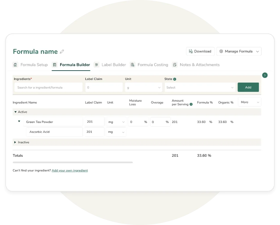 - Create and optimize supplement formulas using our easy-to-use formula builder.