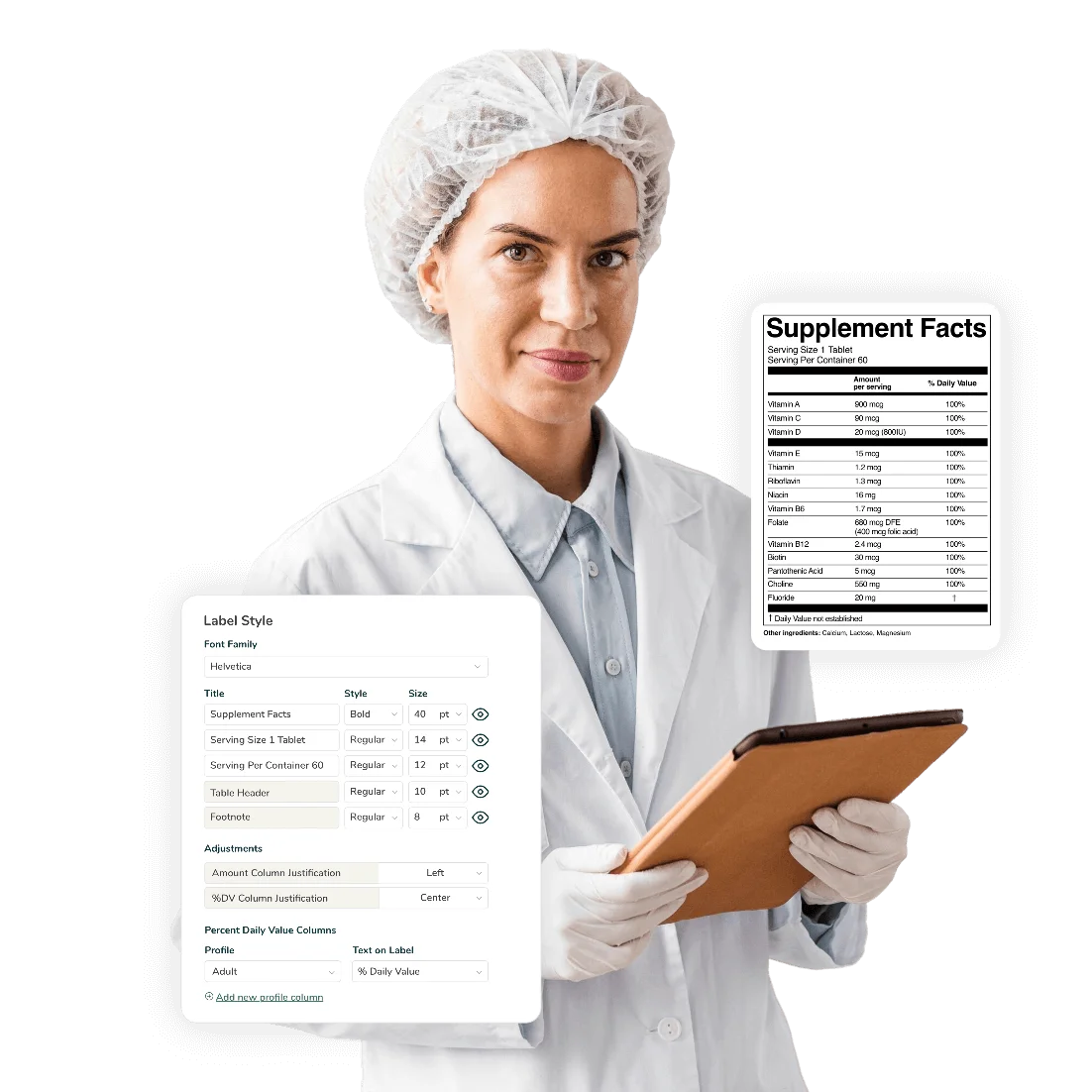 Create accurate Supplement Facts panels with built-in overage adjustments, automated allergen detection, and fully customizable label formats — all aligned with FDA regulations