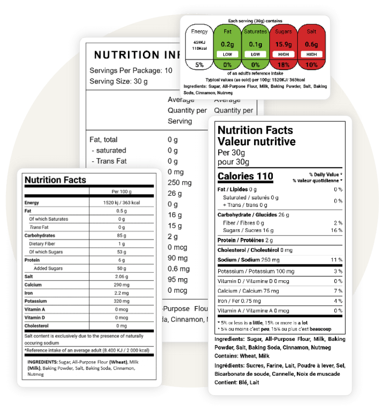 Export compliant labels (FDA, CFIA, UK, EU, Mexico, Australia, GCC) with built-in formats: dual column, bilingual, front-of-pack, per 100 g/mL, and more.
