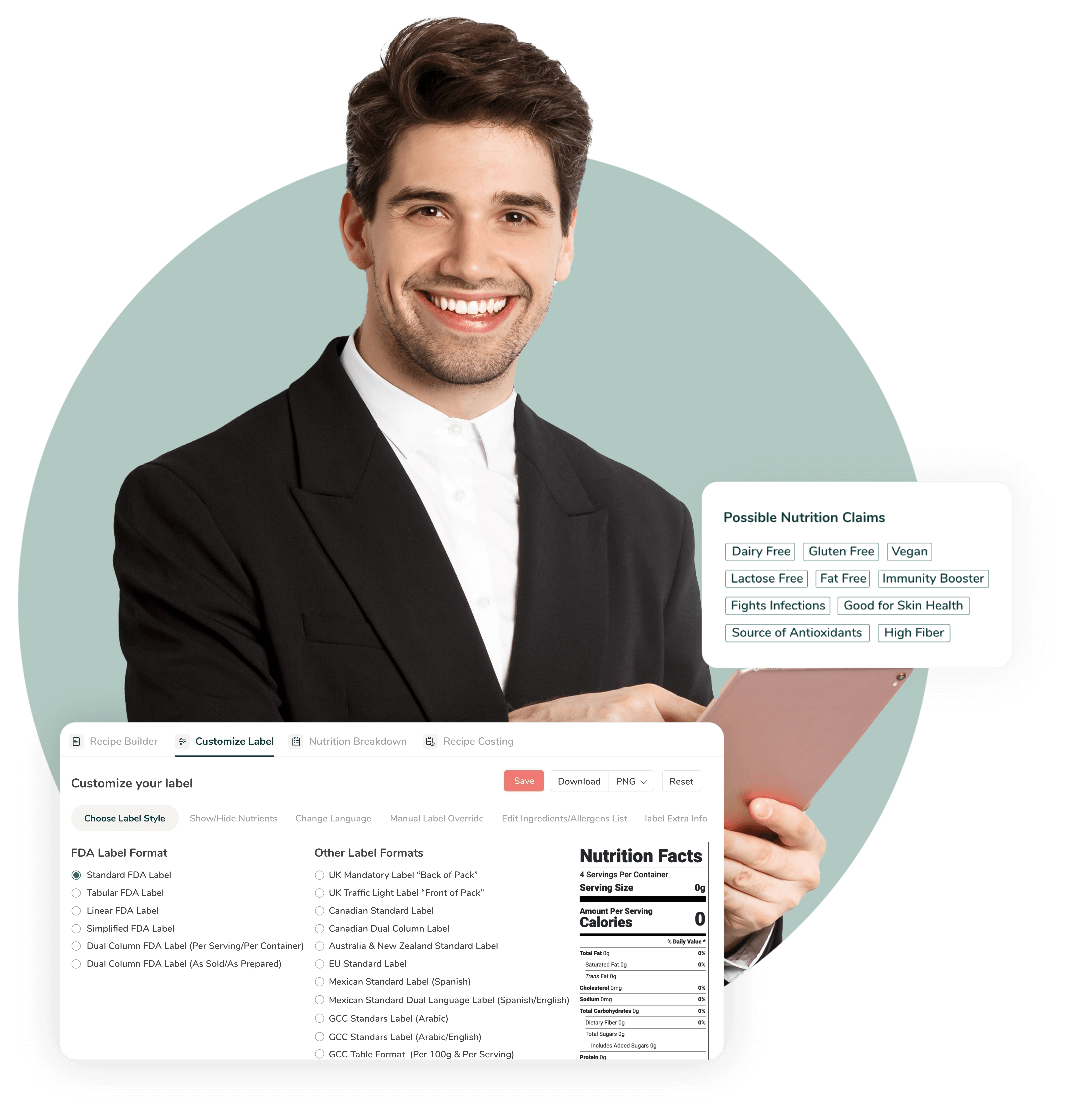- Smart features like label customization, protein adjustment, and suggested claims.