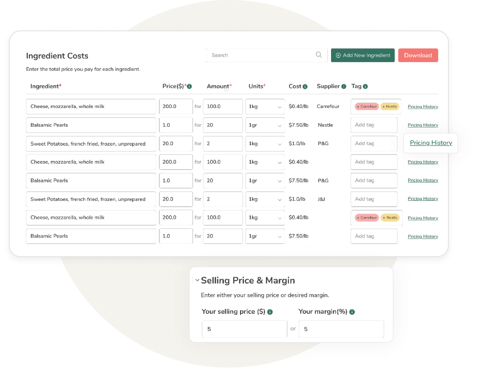 Quickly and accurately calculate recipe costs, including ingredients, packaging, and labor, and set optimal selling prices and target profit margins with ease.