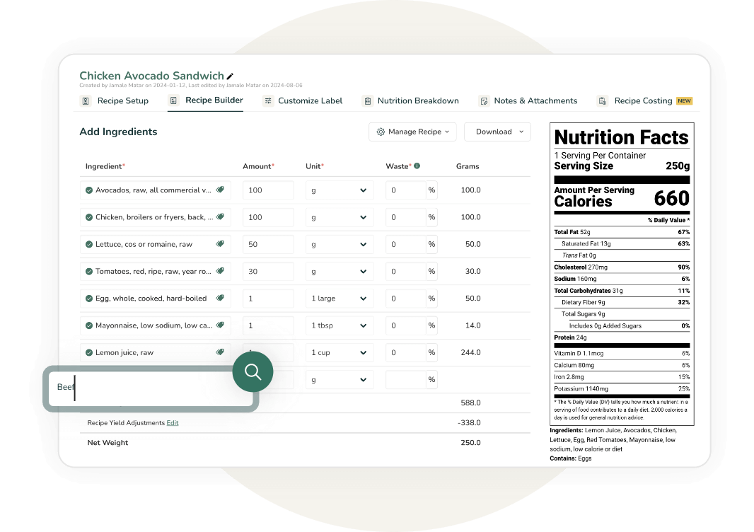 Build recipes easily using our database of 500,000+ verified ingredients, scale recipes with one click, and categorize, duplicate, or delete items for better menu organization and efficiency.