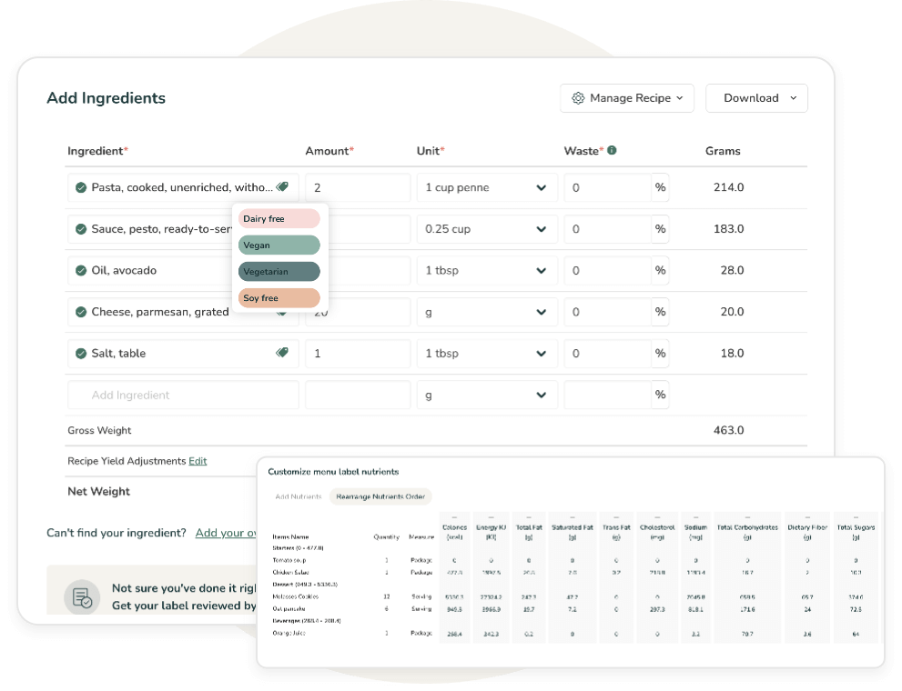 - Get suggestions on potential nutrition and dietary claims that may go with your recipe
