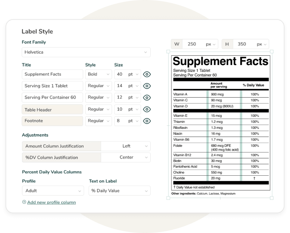 Create accurate Supplement Facts panels with built-in overage adjustments, automated allergen detection, and fully customizable label formats — all aligned with FDA regulations
