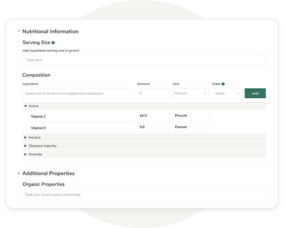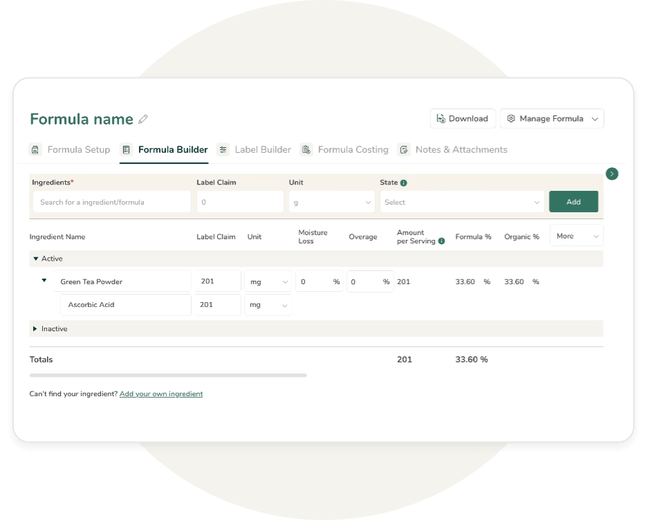 - Create and optimize supplement formulas using our easy-to-use formula builder.