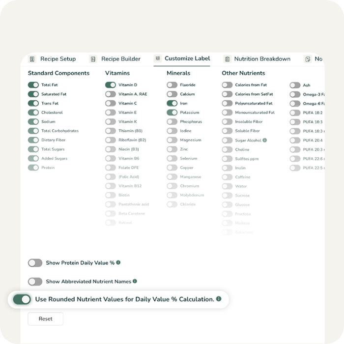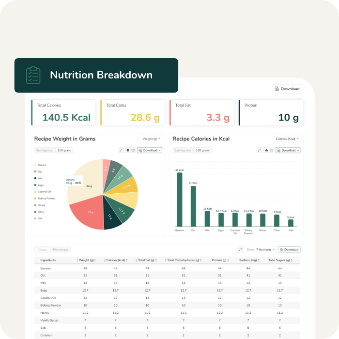 Get in-depth analysis of your recipe’s nutrients, vitamins, & minerals. Identify which ingredients are driving each nutrient, and make informed decisions on how to optimize your recipe.