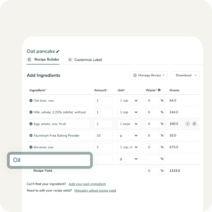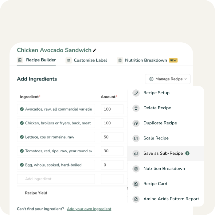 Our user-friendly recipe builder helps you quickly search and add ingredients to your recipe.