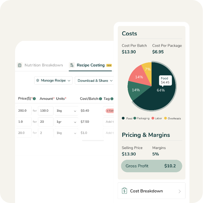Quickly and accurately calculate your recipe costs, including ingredients, packaging, and labor costs. Determine your optimal selling price, target profit margins, and gross profit with ease.