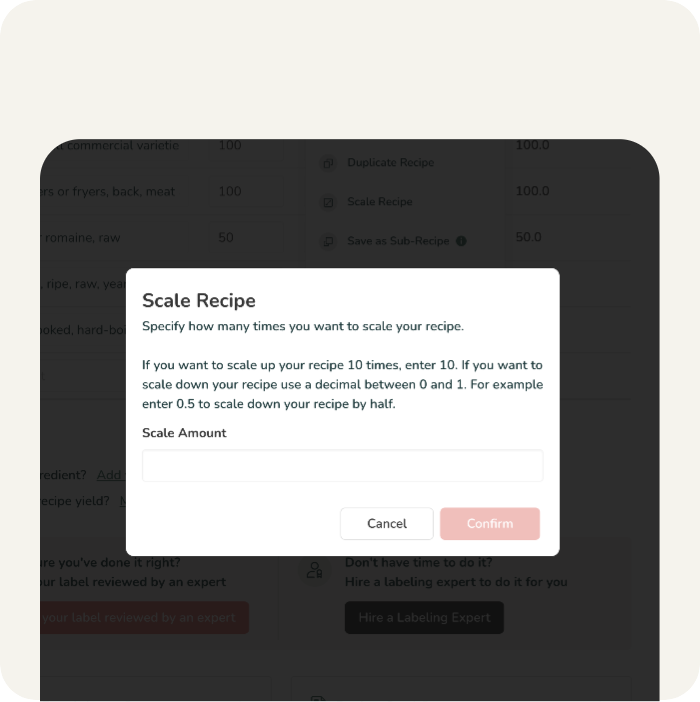 Scale your recipe up or down by specifying the scaling factor and our tool will automatically run the calculations for you.