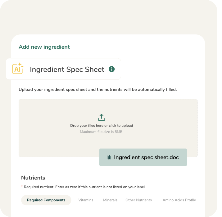Simply upload your ingredient spec sheet, and our AI tool will read the nutrients and automatically fill in your custom ingredients.