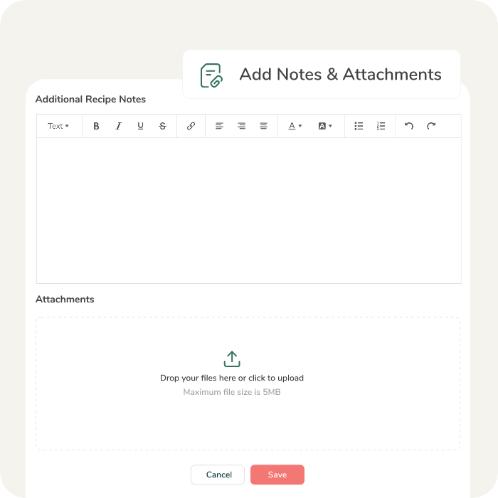 Add custom notes and various attachments like recipe cards & spec sheets to your recipes or custom ingredients.