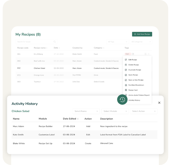 Keep a detailed record of all changes made to recipes and ingredients, including who made the updates. Track revisions and modifications for better version control, compliance, and accountability.