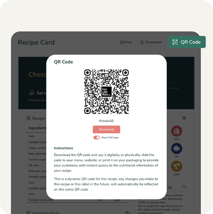 Generate and print comprehensive recipe cards showcasing your ingredients, nutrition facts, allergens, cooking instructions, and a visual representation of the dish.